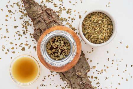 Mate tea in a typical South American calabash, with dried leaves next to it