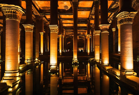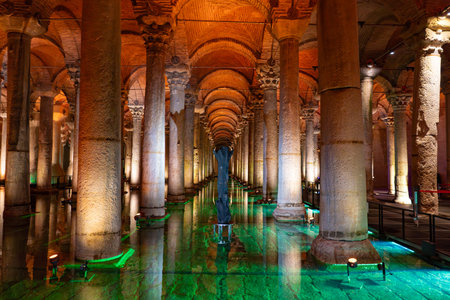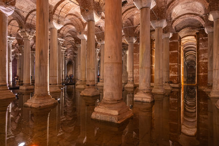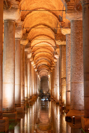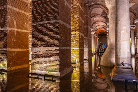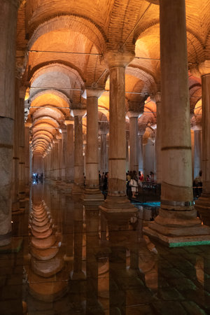 Ancient underground basilica cistern with reflections and arched columns in istanbul. August 12, 2025 Istanbul Turkey.