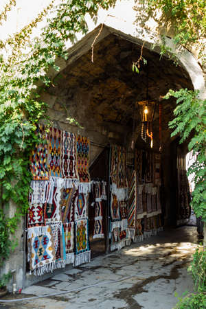 Ancient oriental handmade carpets at Old Town Baku streets. Baku Azerbaijan.