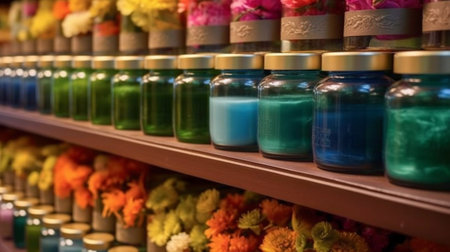 Vibrant glass bottles filled with various paints are displayed on wooden shelves, creating a colorful and artistic atmosphere in a creative workspace, AI generated
