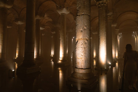 Ancient underground basilica cistern with reflections and stone columns in istanbul. August 12, 2025 Istanbul Turkey.