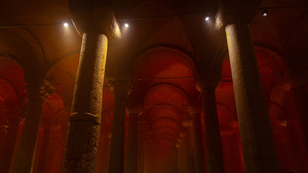 Interior of Basilica Cistern with red ambient light in low angle view. Noise and grain included. Selective focus. Istanbul Turkey - 8.3.2022