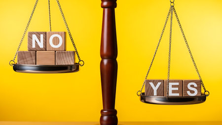 A symbolic representation of decision-making with a scale balancing 'NO' and 'YES' on wooden blocks against a vibrant yellow backdrop.