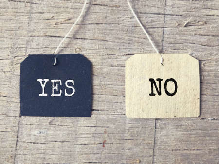 Inspirational words - YES and NO written on a tagged paper. Blurred styled background.