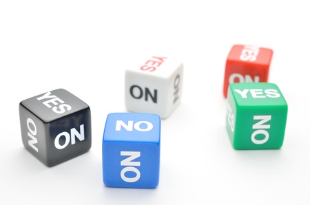Yes spelled in dice letters in foreground with the word no out of focus in background Isolated on white background