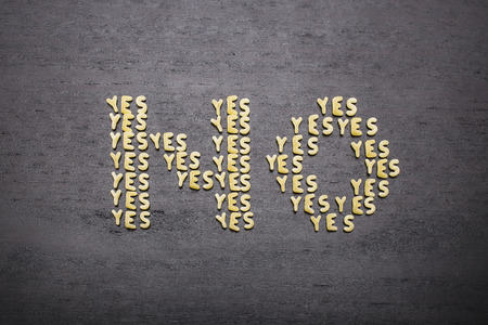 The answer no made up of a set of words yes, with small pasta letters on a dark background of a wooden board, showing the hidden meaning and ambiguity of the agreement.