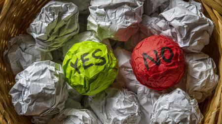 Mixed paper balls marked with affirmations and refusals rest in a woven basket, conveying choices, decisions, or indecision through textured, cluttered composition.