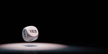 White Dice with Yes Text on Faces Spotlighted on Black Background with Copy Space 3D Illustration