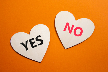 Yes or No symbol. Concept word Yes or No on wooden hearts. Beautiful orange background. Business and Yes or No concept. Copy space