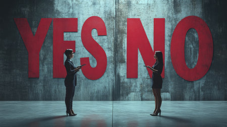 Two businesswomen stand facing each other in an office space, contemplating decisions while framed by a large YES and NO backdrop.