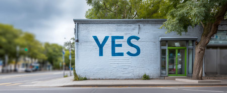 A colorful mural with the word yes on a brick wall near a sidewalk