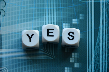 The word YES is made up of square wooden cubes with letters on a gray surface