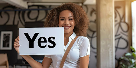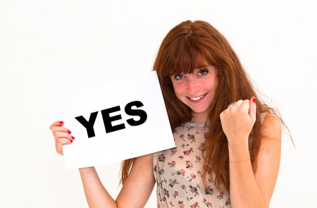 Woman holding a white board with the text Yes in it.