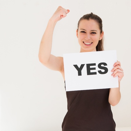 Portrait of young woman holding Yes sign against white background