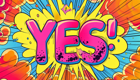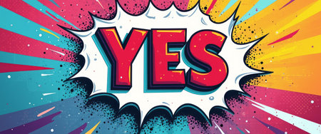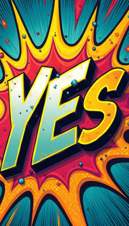 A dynamic and vibrant comic-style illustration features the word YES in bold letters, exploding with colorful bursts and playful textures. This eye-catching design radiates positivity and enthusiasm, making it perfect for conveying excitement and affirmation in various creative projects.