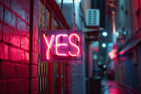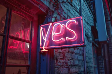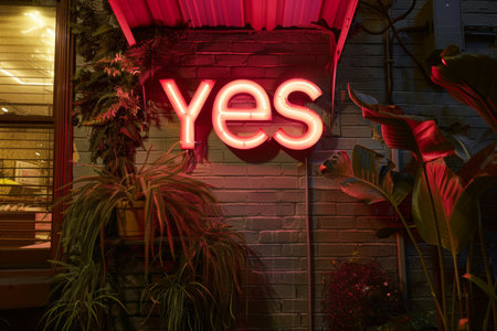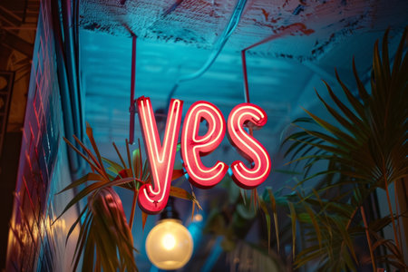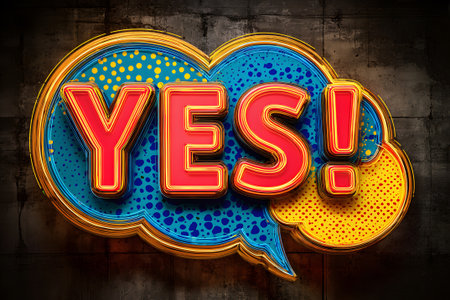 A vibrant neon sign features the word yes in big letters with glowing lights, set in a playful speech bubble. It stands out against a dark, textured background.