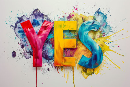 Graphic inscription YES in colored paints and splashes on a white background.