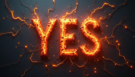 The bold word YES bursts with fiery energy, surrounded by vibrant electric sparks against a dark background. This dynamic image radiates positivity and enthusiasm, making it perfect for motivational themes and affirmations.