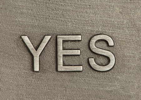 Word YES made with cement letters on grey marble background. Copy space. Strong business concept