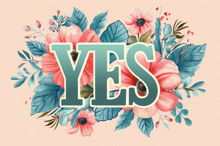 Colorful floral illustration with the word YES surrounded by pink flowers and green leaves on a soft peach background
