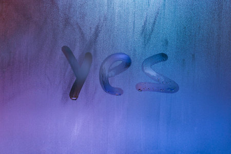 word yes handwritten on foggy night window glass surface
