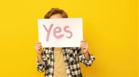 A cheerful child stands against a vibrant yellow background, holding a sign that says yes with excitement and energy.