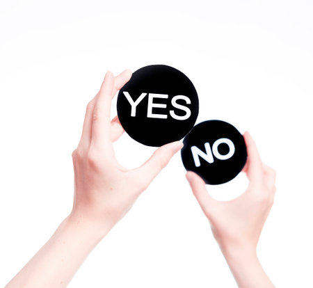 Wood circles with words 'yes, no' on paper white and blue background, copy space. Business concept.