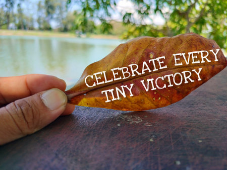 hands holding leaves with the words celebrate every tiny victory. the concept of celebrating every small victory