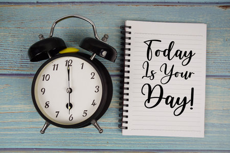 Today Is Your Day! text written on notepad with alarm clock on wooden background