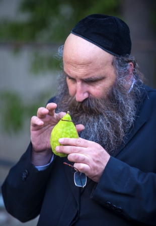 JERUSALEM - SEP 28 : An ultra-orthodox Jewish man inspects an Etrog in the Four spesies market in Jerusalem Israel on September 28 2012 , Etrog is one of the Four spesies used during the celebration of Sukot