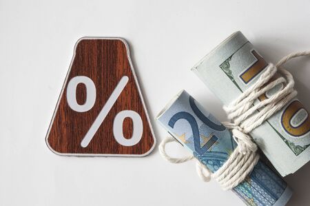 percent sign and roll of banknotes. Copy space for text.