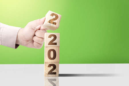 Hand put the 2022 on the stack of the wooden cube. Happy New Year 2022