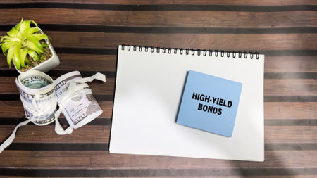Concept of High-Yield Bonds write on sticky notes isolated on Wooden Table.