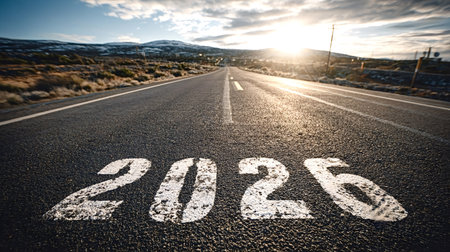 The year 2025 is painted in white characters on an asphalt road stretching towards a bright sunrise, symbolizing new beginnings, future endeavors, and the path ahead