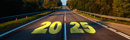 Banner. Text 2025 written on the road in the middle of asphalt road with at sunset. New year 2025 or straight forward concept. Concept of planning, goal, challenge, new year resolution.