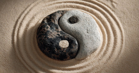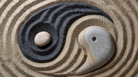 A Yin Yang symbol, crafted from two stones, rests on a bed of sand. The composition includes several other stones, and circular patterns in the sand. The image showcases neutral tones and soft lighting, potentially suitable for commercial and editorial use.