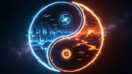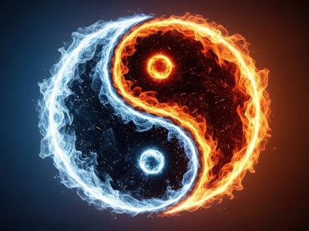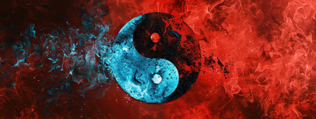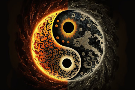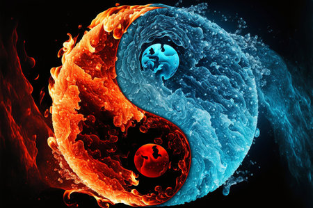 An AI generated illustration of the Yin and yang Chinese symbol with a fire and water combination, concept of opposite but interconnected forces