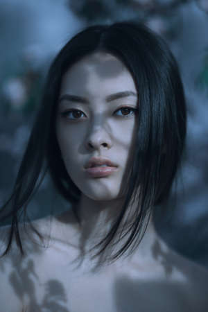 Fashion Art Mystical Spring Model Girl Portrait in Moonlight Night. Sexy Glamour Summer Beautiful Woman with flowers over nature blurred background. Asian beauty.
