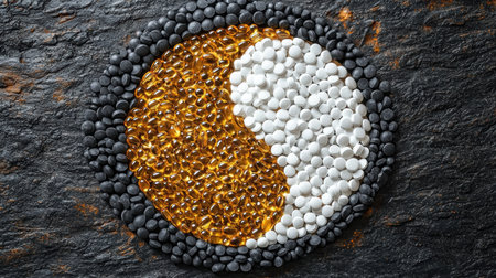 Contrasting colors of vitamin capsules arranged thoughtfully in Yin Yang formation illustrate harmony of balance and well being, capturing attention vibrant colors