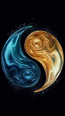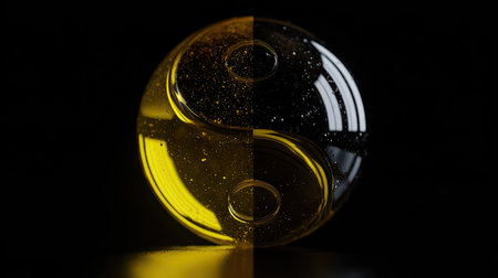 A close-up image displays a stylized Yin Yang symbol divided in half with contrasting gold and black hues. The glossy surface reflects light, creating highlights and shadows. The composition features a symmetrical design against a dark backdrop. Suitable for illustrations and design projects related to balance or harmony.