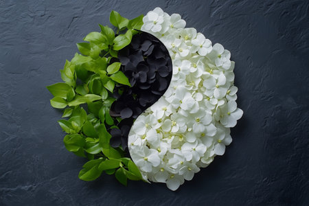 A striking composition featuring a yin yang symbol surrounded by white and black flowers, creating a beautiful contrast on a dark background. Perfect for themes of balance and harmony.
