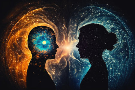 Silhouette of man and woman facing each other against glowing background