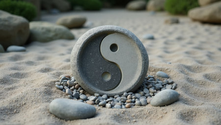 A stone yin and yang symbol sits in raked sand, emphasizing balance and harmony