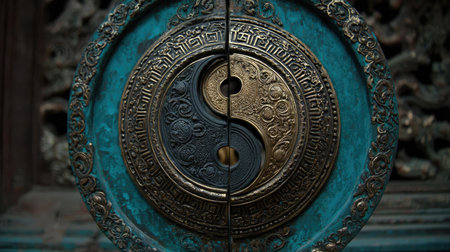 A close-up of a Yin Yang symbol surrounded by an intricate metal design