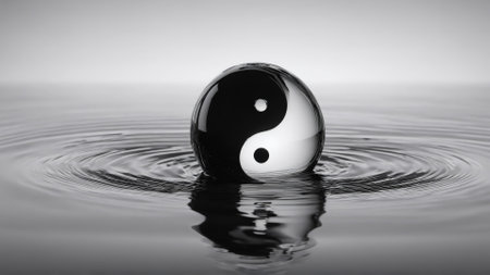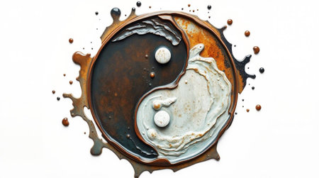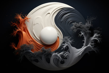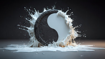 An artistic representation features a Yin Yang symbol emerging from a splash of white liquid against a dark backdrop. The composition showcases dynamic movement with the interplay of light and shadow, highlighting the contrasting black and white elements. Suitable for conceptual illustrations, design projects, and visual communication materials.