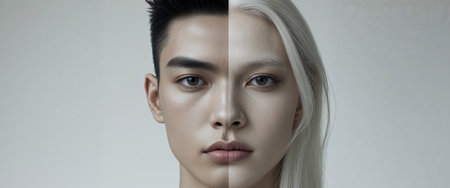 AI Generated. Gender transition concept with image of a frontal face split in two between male and female genders