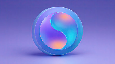 A 3D rendered Yin Yang symbol presents with soft gradients of blue, purple, and orange. The composition features a glossy finish, set against a matching purple backdrop. The lighting suggests a studio setting, suitable for illustrating concepts such as balance and harmony in various commercial applications.