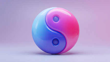 A digital illustration presents a Yin Yang symbol, split into blue and pink sections. The object has a glossy texture, with subtle lighting effects adding depth. The overall composition is symmetrical, set against a gradient background. This image is suitable for various design projects and concepts related to balance.