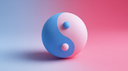 A three-dimensional Yin Yang symbol is depicted, divided into blue and pink halves with two smaller spheres. The object is rendered with a soft, matte texture, set against a gradient background of complementary colors. The lighting suggests a studio environment. Suitable for diverse commercial or conceptual applications.