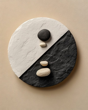 A Yin Yang symbol, crafted from light and dark stones, sits on a textured beige background. The design features a spiral pattern within each side, adding visual depth. The image's composition appears balanced, with soft lighting, suggesting a serene and contemplative atmosphere. Suitable for illustrating concepts of balance, harmony, and well-being in various visual projects.